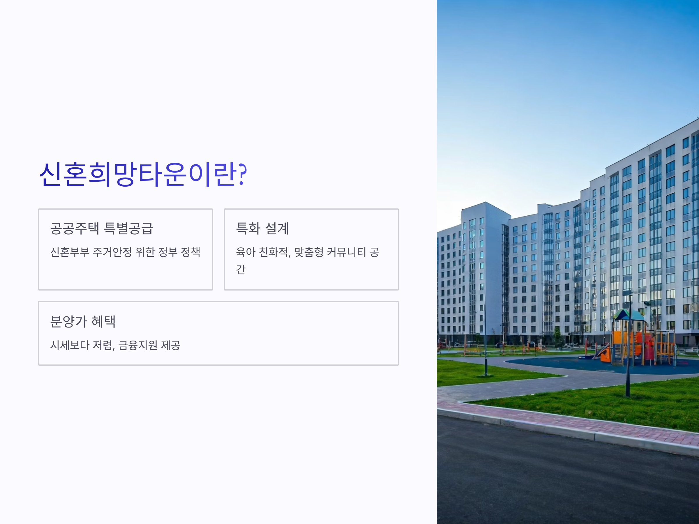 신혼희망타운은 정부가 신혼부부의 주거 안정을 위해 특별히 공급하는 공공분양 및 공공임대주택입니다. 단순한 공급을 넘어 육아 친화적 설계, 맞춤형 커뮤니티 공간, 신혼부부 특화 금융지원까지 제공되는 것이 핵심입니다.