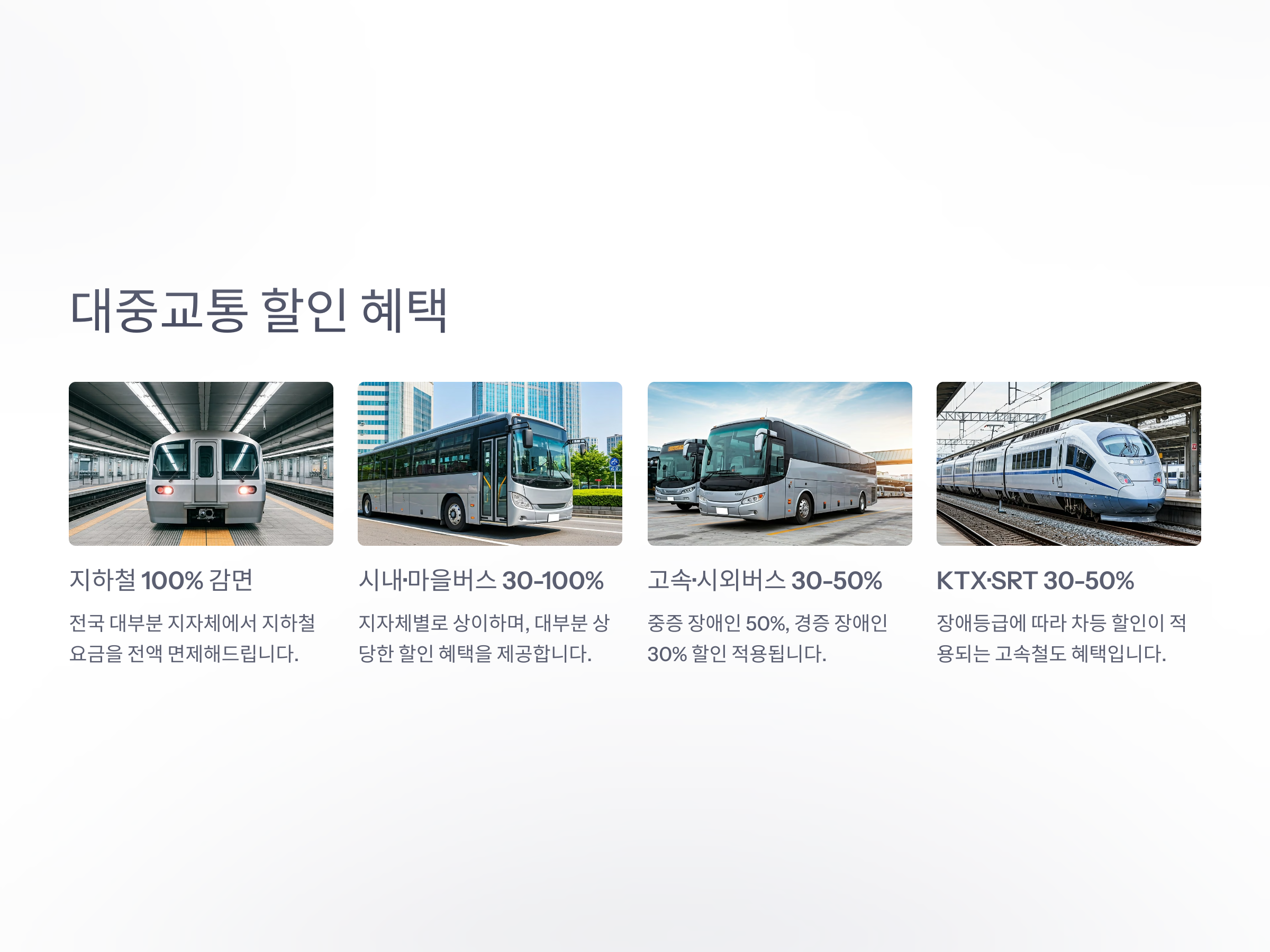 - KTX: 30~50% 할인 (장애등급별 차등)