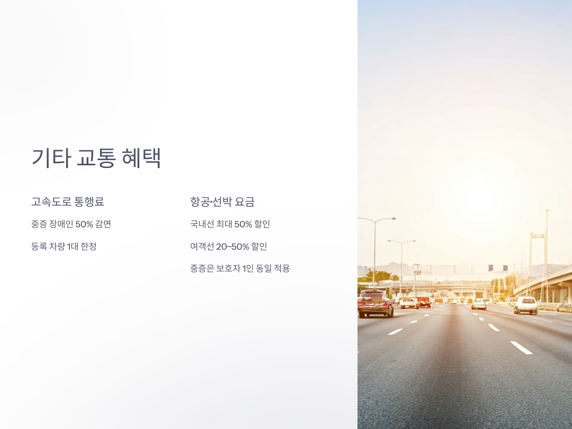 - 중증 장애인: 통행료 50% 감면