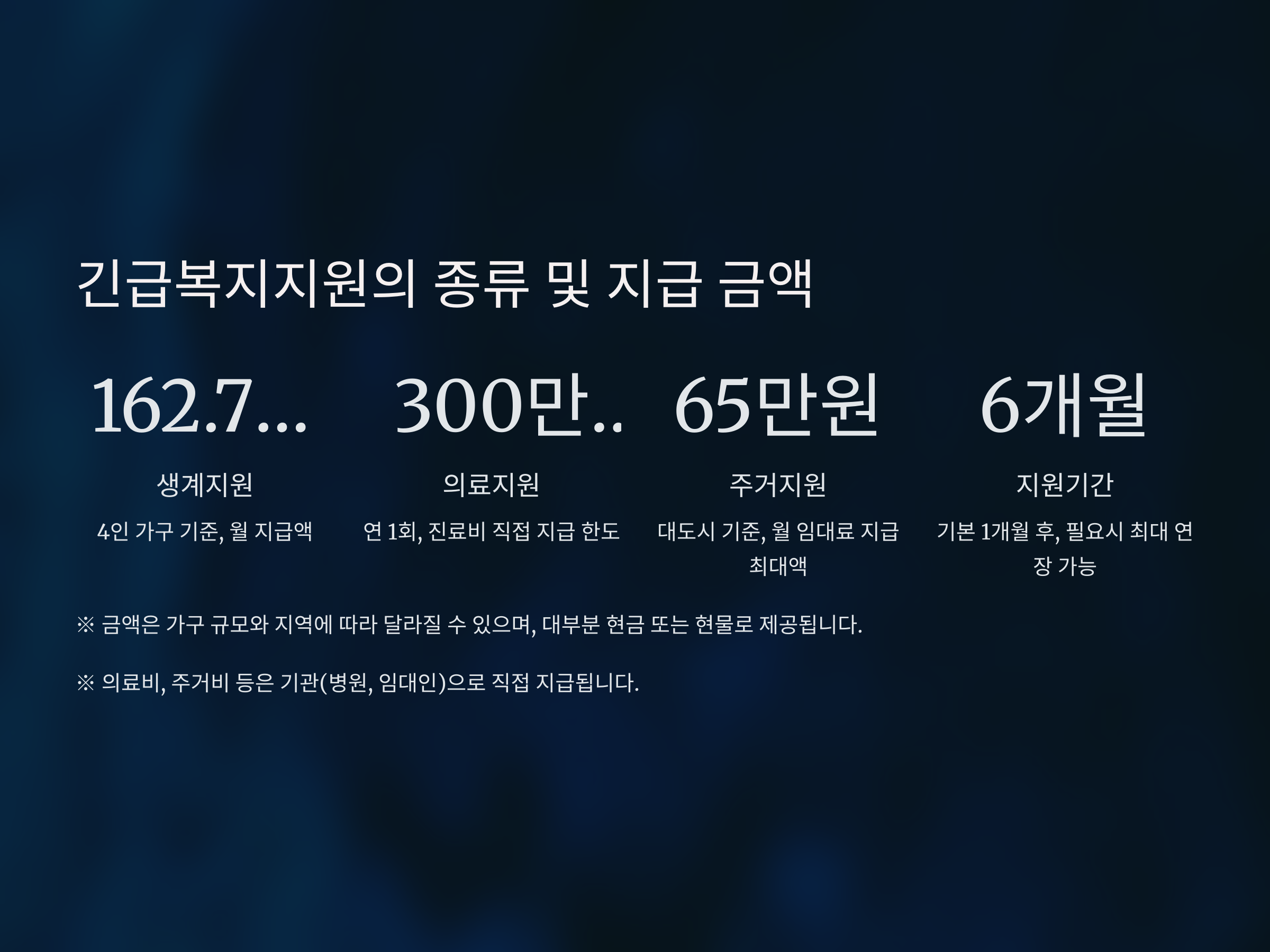 | 생계지원 | 월 162만 7천 원 | 현금 |