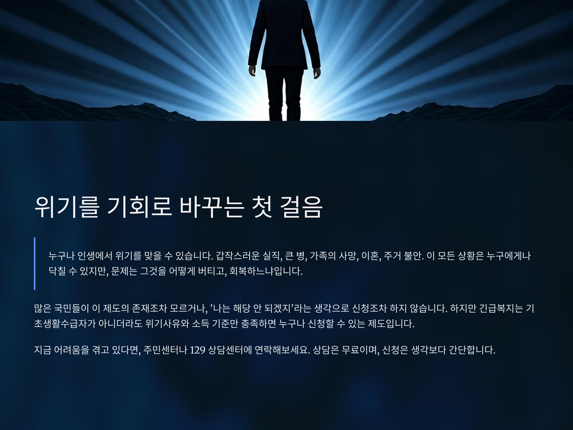 국가는 당신의 회복을 기다리고 있고, 그 첫 시작이 바로 긴급복지지원제도 신청일 수 있습니다.