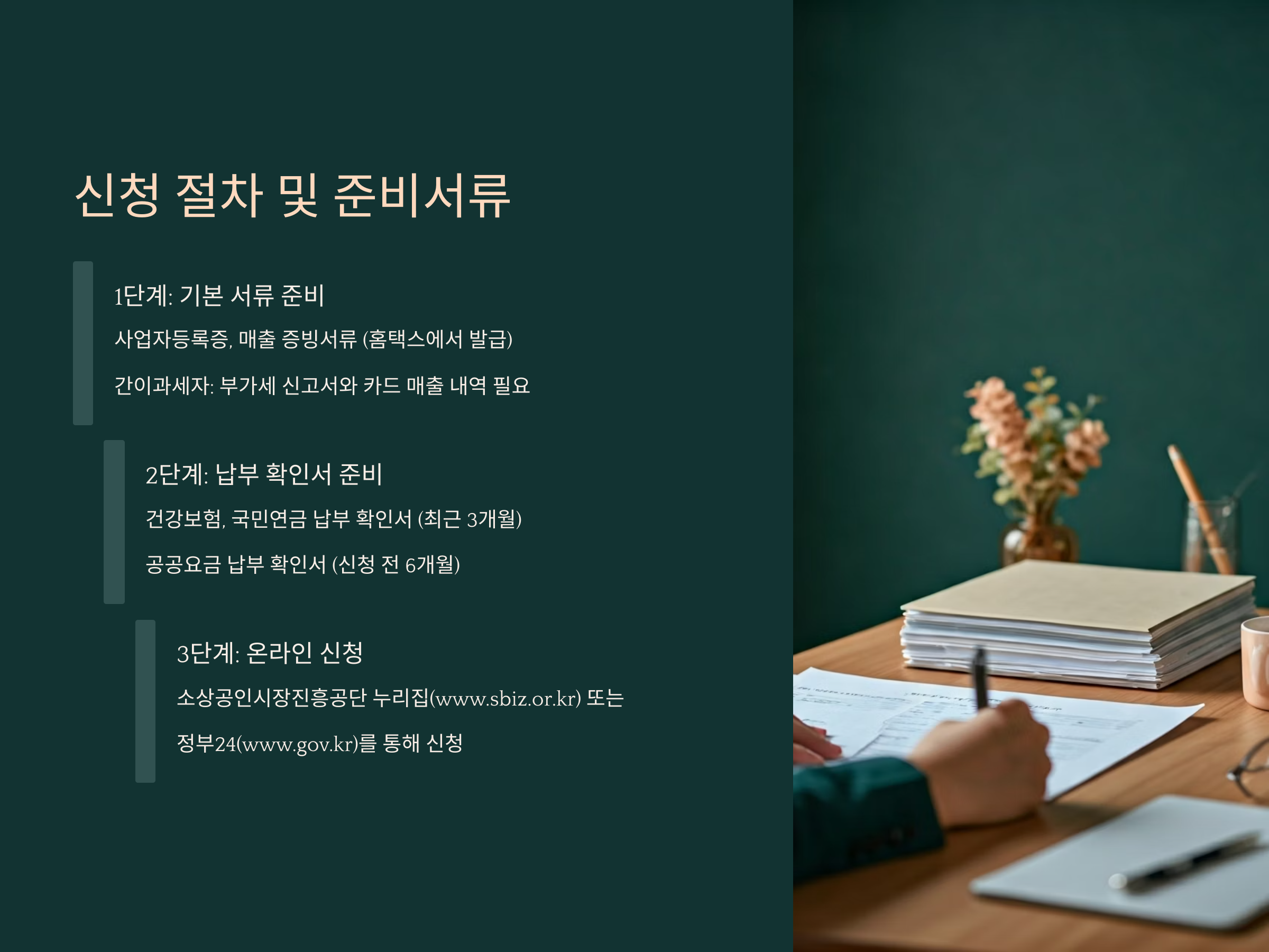 이 프로그램은 ‘성실 폐업’ 인정자에 한해 제공되며, 세무서 폐업 신고 이력과 국세청 미납 여부 등을 심사합니다.