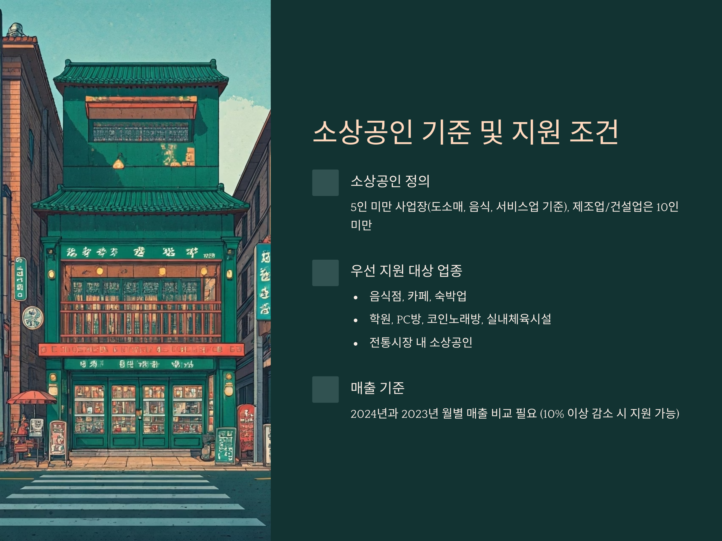 - 지원 대상: 2024년 기준 연매출 10억원 이하 소상공인