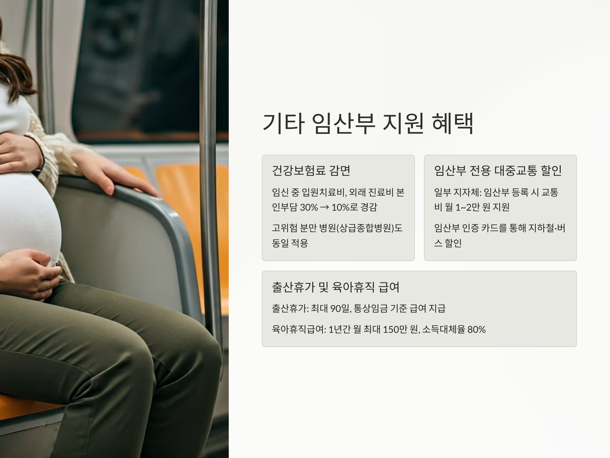 - 일부 지자체(서울, 인천, 광주 등): 임산부 등록 시 교통비 월 1~2만 원 지원