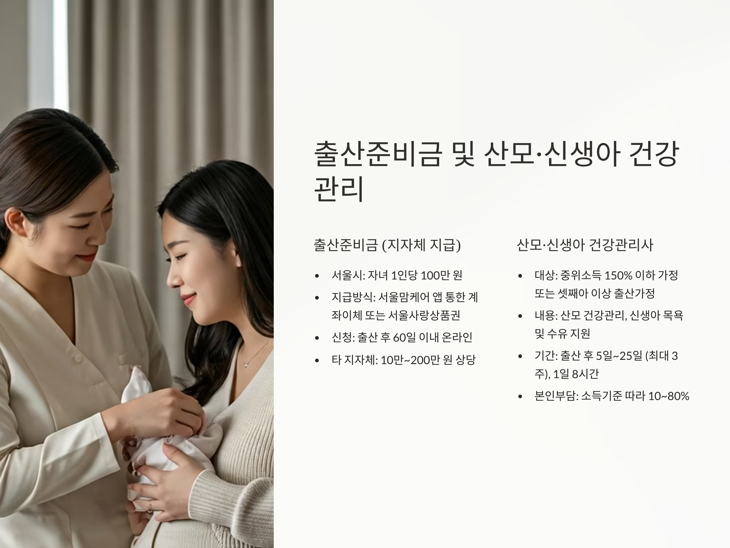 2025년 기준으로 출산준비금과 산후관리 서비스는 국가와 지자체가 함께 운영하는 보편적 지원 정책입니다.