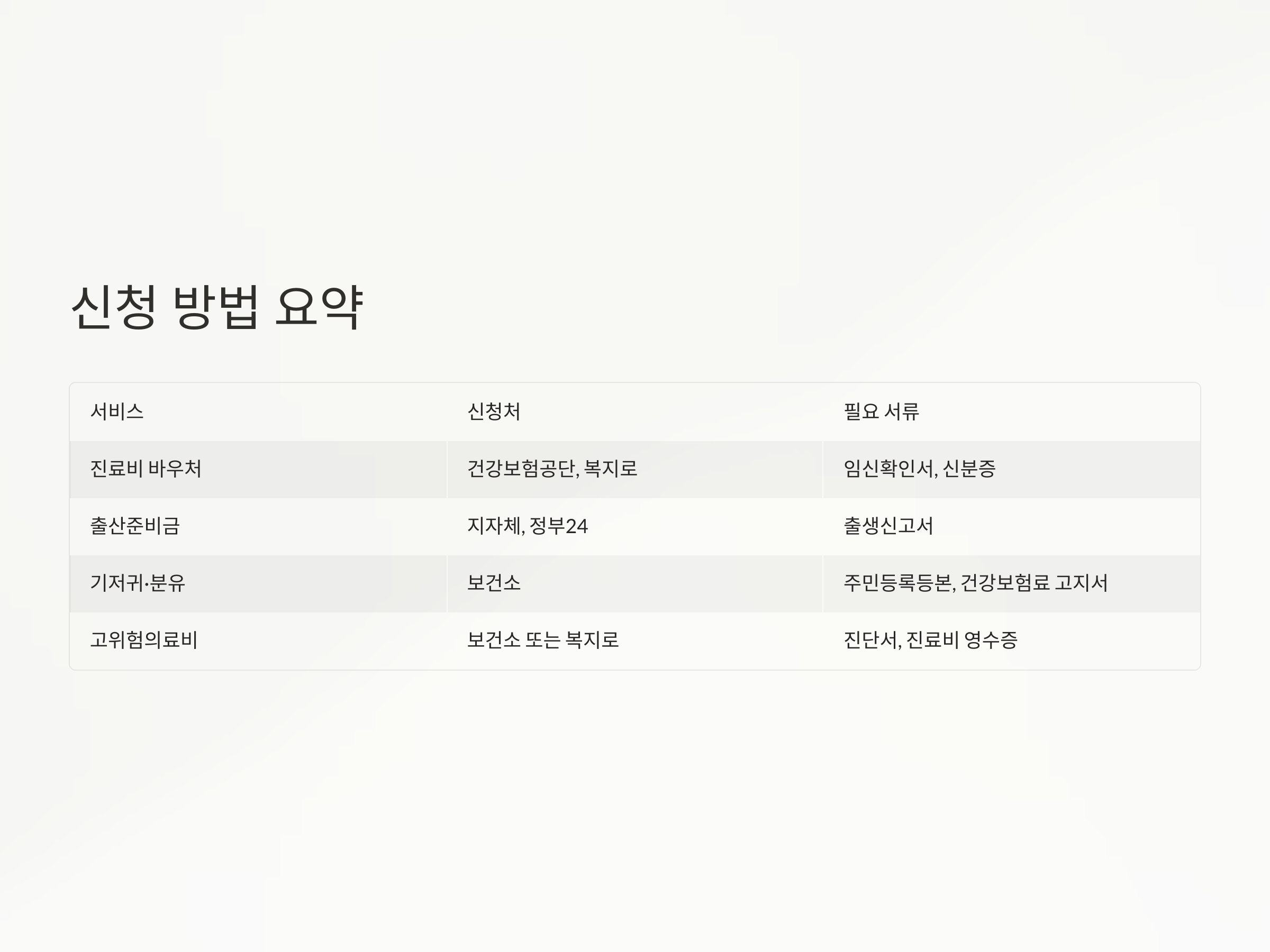 | 진료비 바우처 | 건강보험공단, 복지로 | 임신확인서, 신분증 |