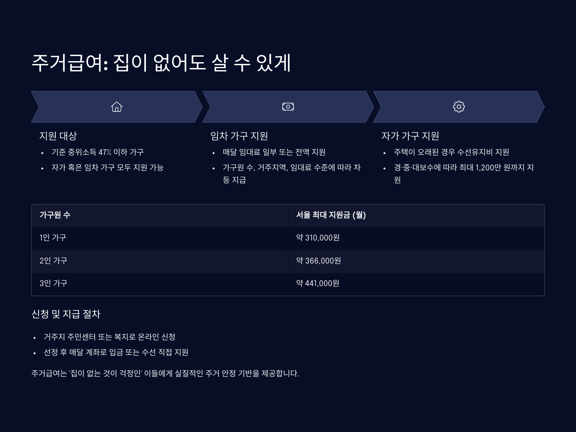 주거급여는 ‘집이 없는 것이 걱정인’ 이들에게 실질적인 주거 안정 기반을 제공합니다.