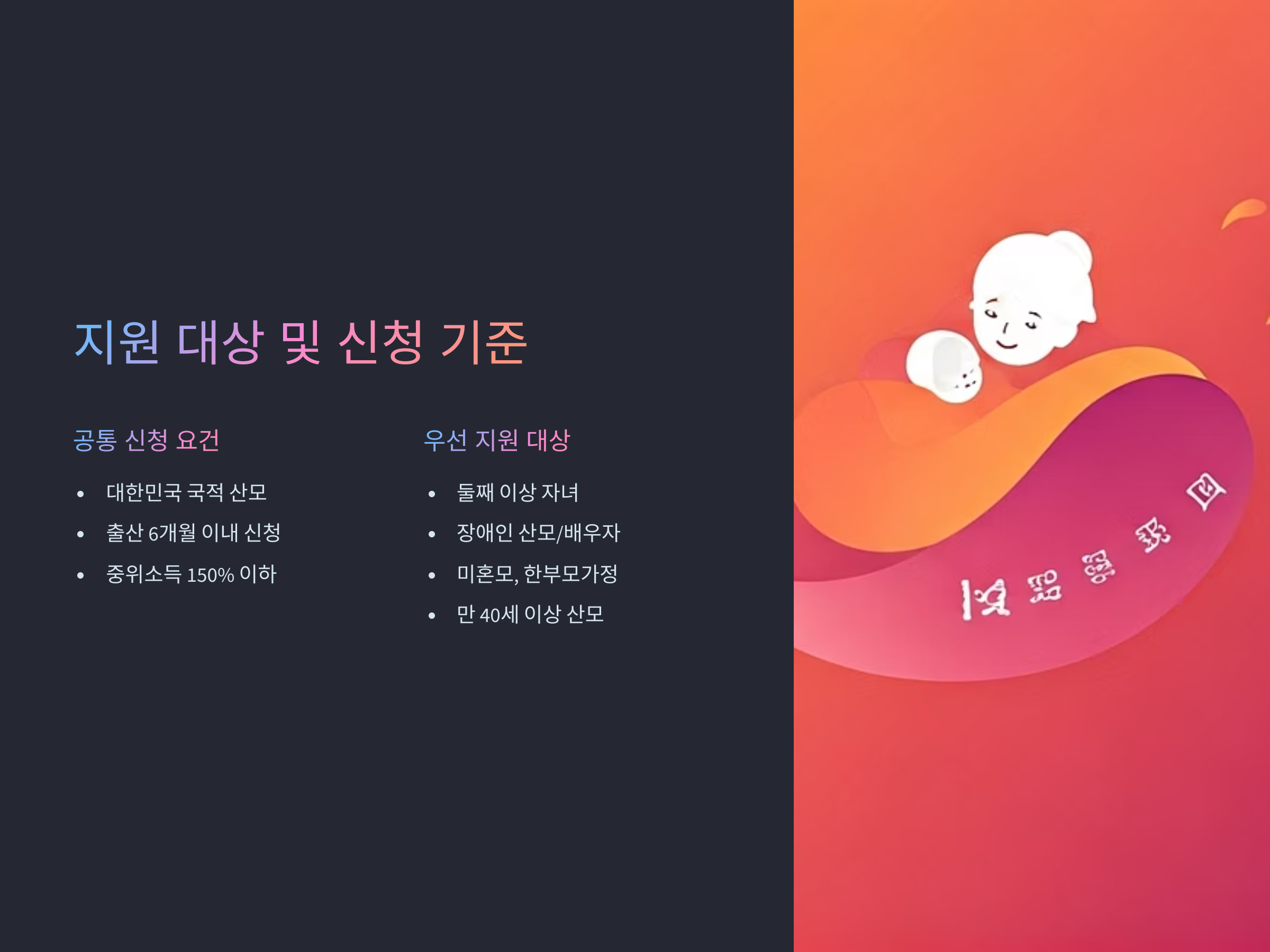 2025년 기준 가구의 건강보험료 부과액을 기준으로 산정되며, 중위소득 150% 이하인 경우 지원 대상이 될 수 있다. 단, 둘째 이상 출산, 장애 산모, 미혼모, 다문화 가정 등은 소득 기준 상관없이 우선 지원 대상으로 분류된다.