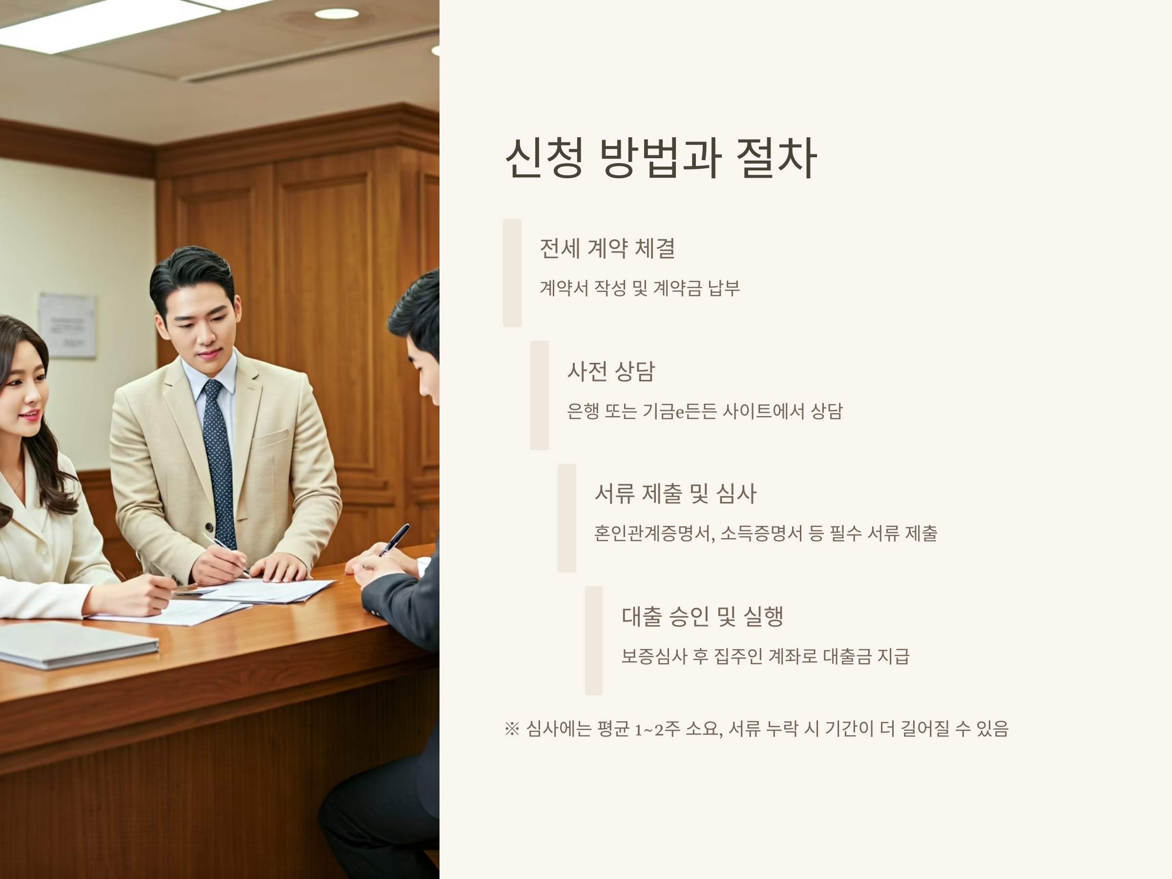 ※ 심사에는 평균 1~2주 소요되며, 서류 누락 시 기간이 더 길어질 수 있음