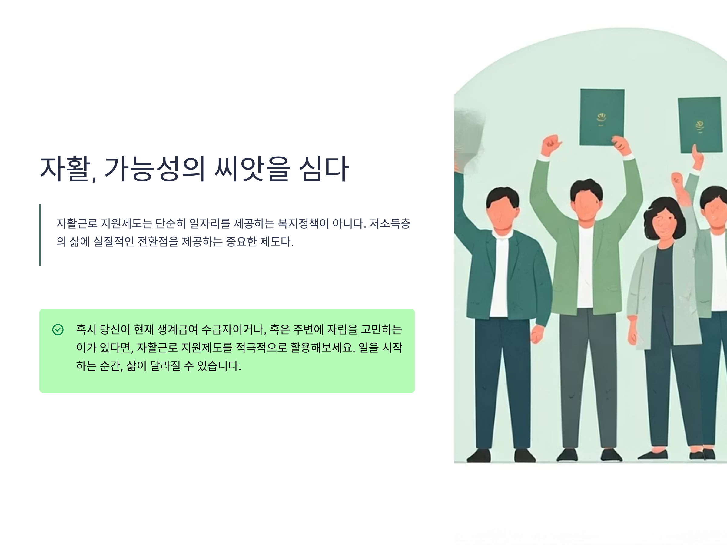 혹시 당신이 현재 생계급여 수급자이거나, 혹은 주변에 자립을 고민하는 이가 있다면, 자활근로 지원제도를 적극적으로 활용해 보자.