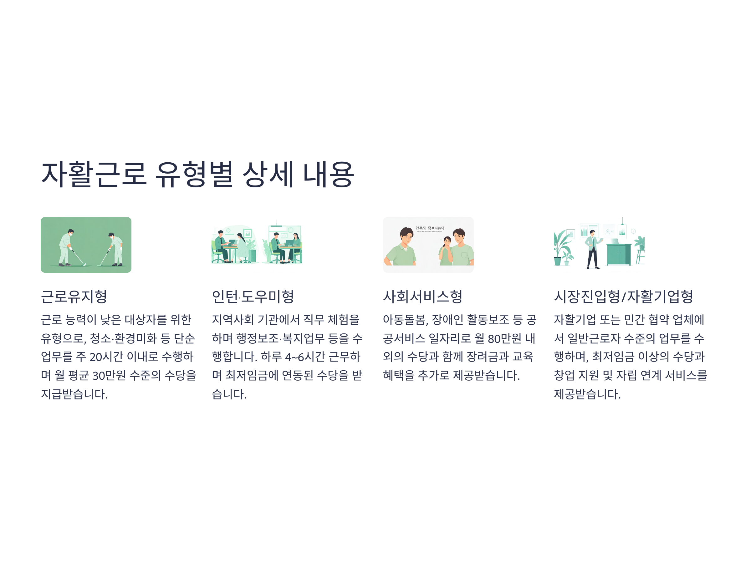 각 유형은 참여자의 조건(연령, 건강상태, 역량 등)에 따라 배정되며, 참여 기간은 보통 6개월~2년 사이로 설정된다. 정기 평가를 통해 유형이 상향될 수 있으며, 성실 참여자에게는 창업 및 민간 취업 연계 우선순위가 주어진다.