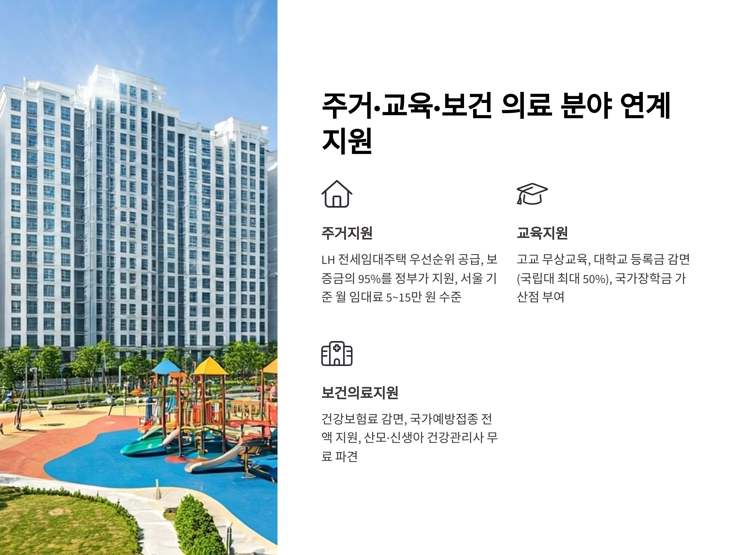 - 주거·교육·고용 연계 지원 확대: LH전세임대, 대학등록금 감면, 자활사업 연계 등