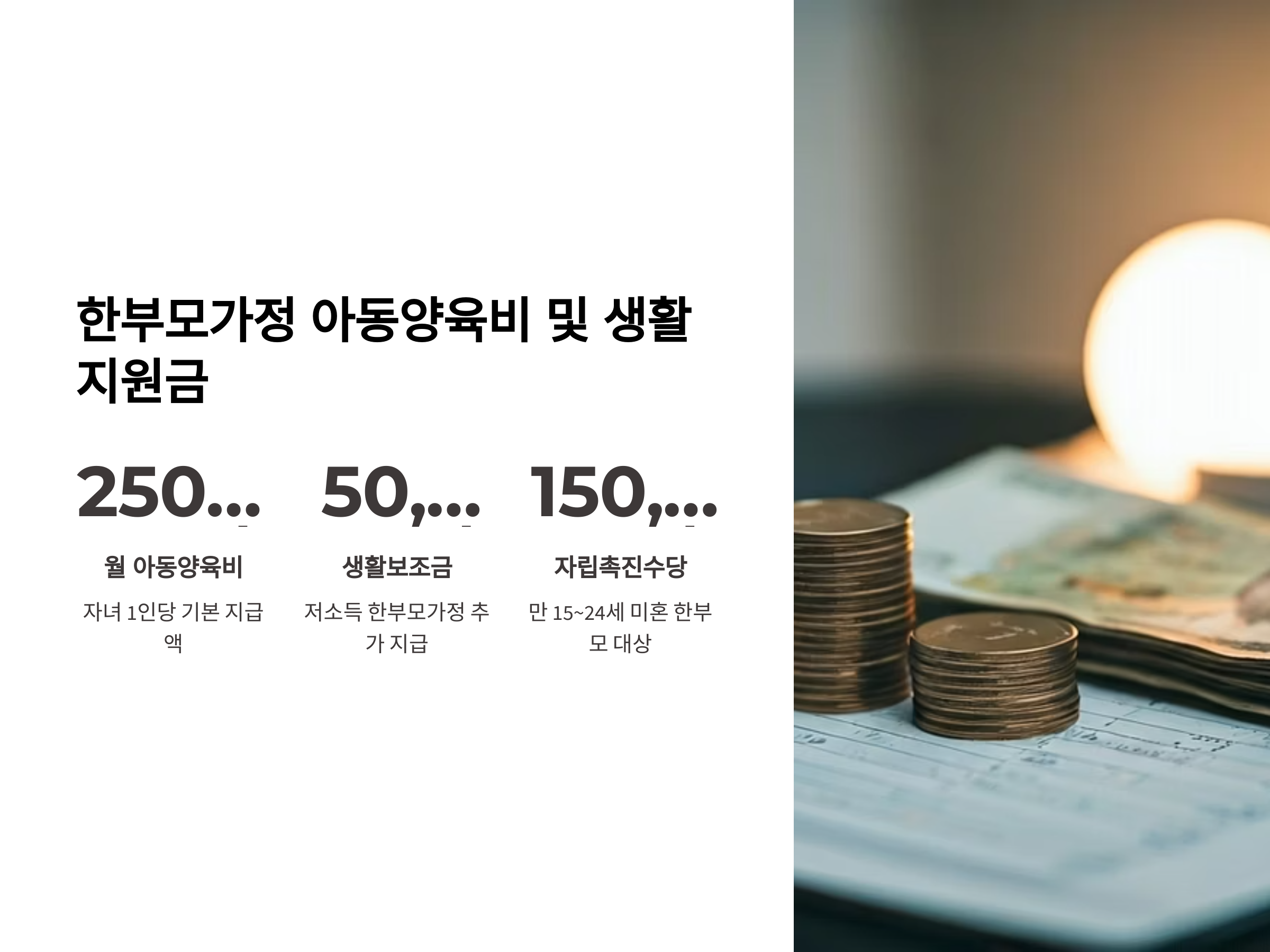 - 자립지원금: 만 24세 이하 한부모에게 최대 1,000만 원 일시 지급 (자립 계획서 제출 시)